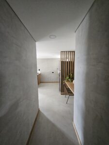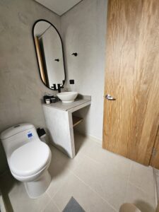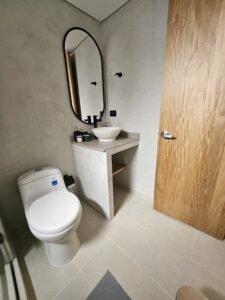 - Baño tipo hotel con tocador flotante y espejo ovalado