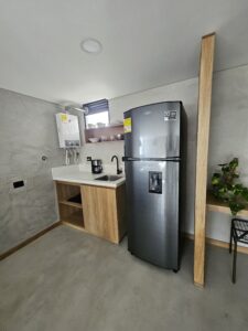 - Cocina completa (nevera amplia, estufa a gas, cafetera, menaje)